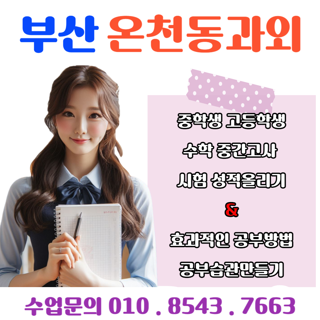 해운대 중동과외 고1 수학 중간고사 성적을 올리는 전략! (0) 2024.03.18 해운대 우동과외가 추천하는 고등학생 중간고사 대비 방법 (0) 2024.03.17 사직동 과외 중간고사 고1 수학 성적 향상 전략 (0) 2024.03.14 구서동과외 고1 수학 실수 줄여 효과적인 시험 공부방법 (0) 2024.03.13 온천동 초등학생 겨울방학과외 다가오는 새학기 대비하기 (0) 2024.01.19