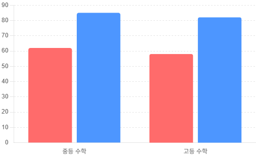 처음 수업을 시작할 때는 점수가 62점 정도로 부족했는데, 꾸준히 맞춤형 수업을 받으면서 88점까지 올랐어요. 이 그래프를 보면 단순히 문제를 푸는 능력만 좋아진 것이 아니라, 시험을 대하는 자신감도 커졌다는 걸 알 수 있어요. 그래프의 파란색 막대는 수업 후 성적을, 빨간색 막대는 수업 전 성적을 보여주는데 차이가 확실히 드러나요.