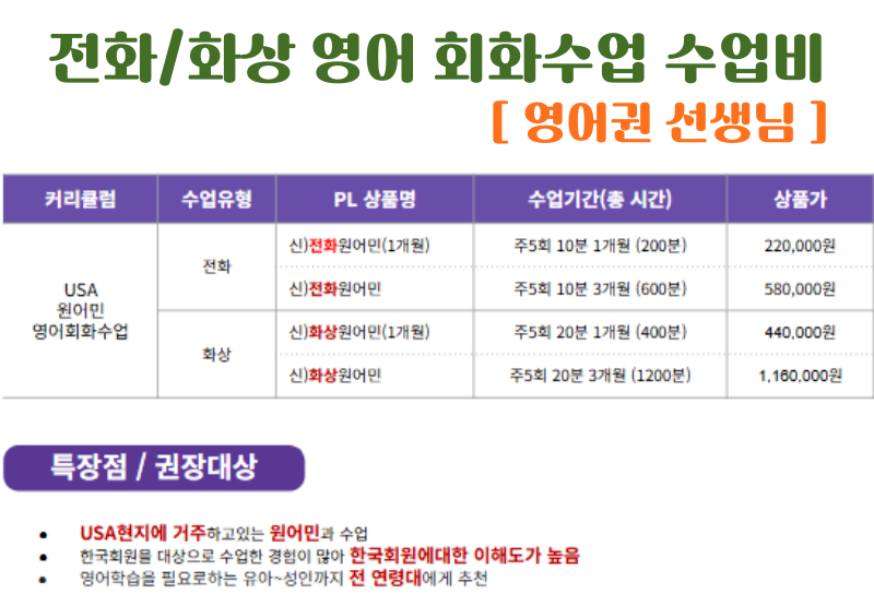 영어권 선생님 전화/화상 영어회화 수업 수업비 시간 대비 최대 성과를 위한 현명한 선택